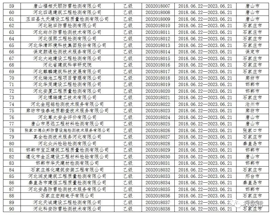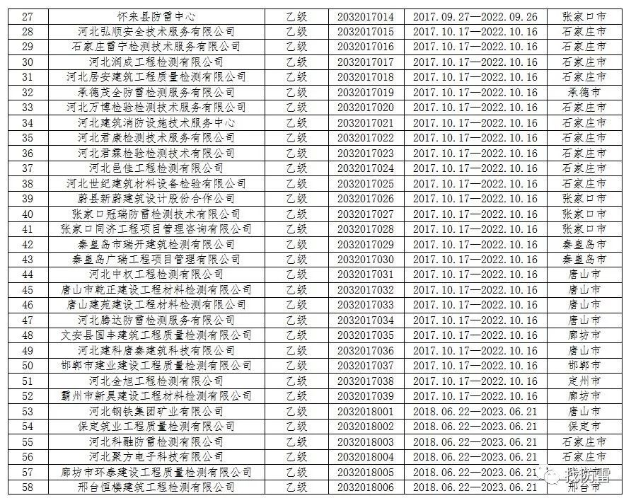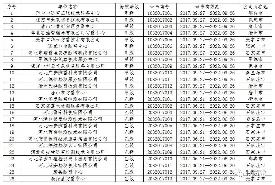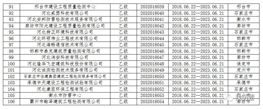 (一)河北省气象局颁发的雷电防护装置检测资质单位,共106家。